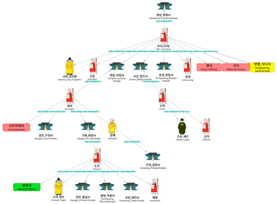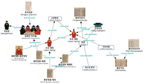 However, despite the development of information technology, systems or visual services that provide systematic classification and search functions for cultural resources have not yet been developed [2]. Search services are used to search for information on certain content. These search services basically receive search keywords from users and provide highly relevant information. However, existing search services simply provide one-dimensional and fragmentary information related to the search keywords. For example, if we search “Joseon”, the current search service simply provides all the information that includes “Joseon” in the sentence. If we want to see the relationship between “Joseon” and “Gyeongbokgung Palace”, we need to search for “Joseon” and “Gyeongbokgung Palace” separately and combine simple information from the two sets of results. Thus, it takes a considerable amount of time to deduce the relationship between search keywords because of the difficulty involved in the search.