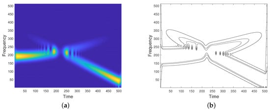 Equation (4) shows that spectrogram reaches its maximum along the curve , defined as the ridge curve or IF curve. Equation (3) also provides a model for the spectrogram of MCS, as shown in the sequel. Without loss of generality, let us consider the spectrogram of a two-component signal , as the one depicted in Figure 1a. By STFT linearity and taking into account Equations (3) and (4), spectrogram can be written as