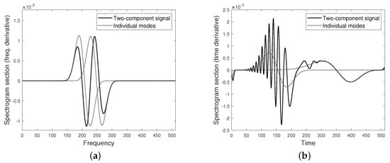 For each fixed u, two frequency points are needed to define the linear system as in Equation (11). In the case of a single mode, as well as separated components, any pair of frequency points can be employed. On the contrary, a more careful selection is required for close and overlapping components. In order to prevent instabilities due to the presence of cross-terms, it is convenient to uniformly select (i.e., they do not depend on the specific u) such that they satisfy the WSC, as in Definition 1. Taking into account Equation (10), as a function of variable ξ is close to the spectrogram section of the single component (cross-terms are negligible). As a result, the approximation of by is more accurate, as in the case shown in Figure 3a. Conversely, it generally holds