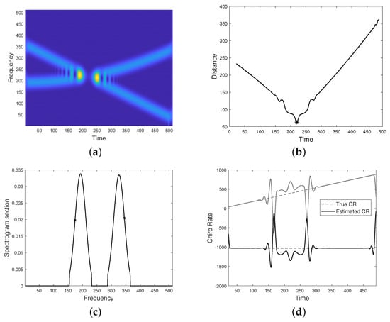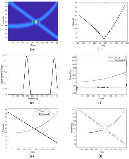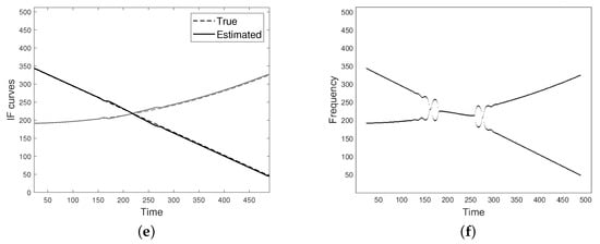 Figure 7 refers to a FM two-component signal with intersecting modes and destructive interference. As shown in (a), spectrogram resolution is significantly reduced at the non-separability region. The distance function, as defined in Equation (26), and the crossing point estimated as its minimum are depicted in (b). A generic spectrogram section with emphasized points for defining the linear system is shown in (c). The estimated CRs are depicted in (d) and the final IFs estimation, provided by the proposed approach, is shown in (e). The latter can be compared to the result given by the classical peaks detector method in (d). As it can be observed, the proposed method better improves IF curves resolution at the non separability region.