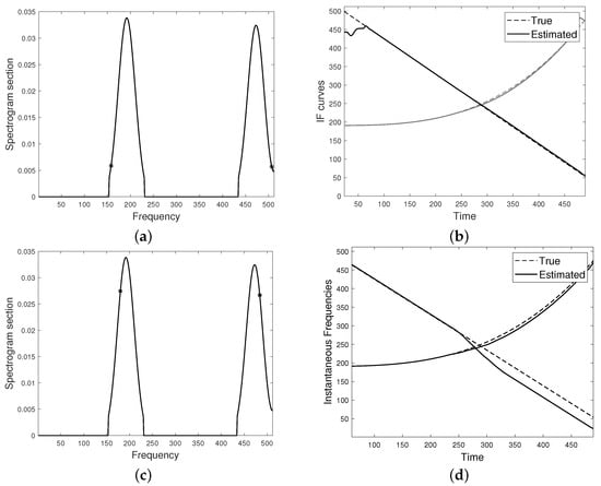 The second test, illustrated in Figure 5, concerns a FM two-component signal with intersecting modes, that interfere with each other additively. The spectrogram is shown in (a). As it can be observed, some boundary effects occur, therefore the very initial times have not been employed in the procedure, in order to prevent instabilities in the final estimate. The crossing point, detected by minimizing the distance function as in Equation (26), is depicted in (b). A generic spectrogram section is shown in (c), with emphasized points used for defining the linear system. The estimated CRs are depicted in (d) and the final result is shown in (e). As it can be noticed by comparison with (f), the proposed method outperforms the classical peak detector algorithm at the non-separability region. Figure 6 aims at evaluating the sensibility of the proposed method to the frequency points selection. With reference to the spectrogram shown in Figure 5a, (a) emphasizes two points lying on a lower characteristic curve. This choice results in IFs estimation shown in (b). As it can be observed, the result is comparable to the one in Figure 5e, except for some instabilities at the left-hand boundary side. Indeed, the lower the characteristic the more the boundary effects. Figure 6c shows two frequency points on the lateral spectrogram sides which are closer to spectrogram maxima. The corresponding IFs estimation is provided in (d). As it can be observed, the result is less accurate.