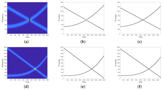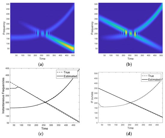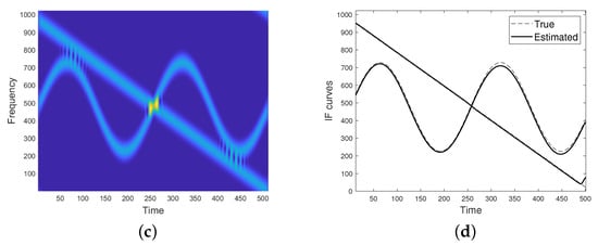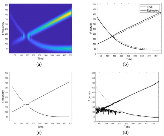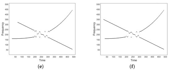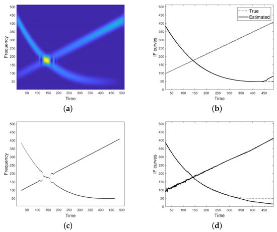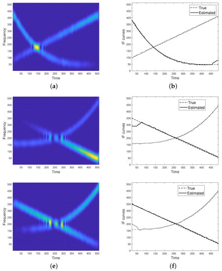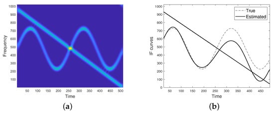 Unfortunately, if the condition in Equation (6) is not met, the two modes have close or even overlapping supports both in time and frequency, resulting in non-negligible cross-terms. In particular, for a fixed u belonging to the non-separability region, spectrogram may reach its maximum value at a frequency point different from both the ridge points of the single modes, as in the case shown in Figure 1d. For this reason, IF detectors/enhancers relying on spectrogram maxima are unreliable, especially in case of crossing IFs such that their TFDs show a lack of resolution at the non-separability region, as for the spectrogram shown in Figure 1. As it can be observed, the detected maxima in (e) do not well approximate IF curves in (b) at the region where they get closer and intersect.