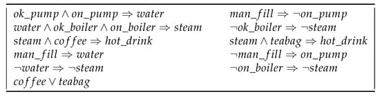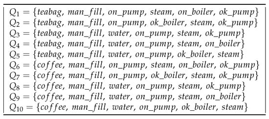 Therefore, with the ideas introduced in this paper we can certify the completeness (and soundness) of the partitions made by the authors. In general terms, it is not necessary for computing all w.b. unless it is required for some kind of global analysis of the KB. A weak basis can be selected, for each use case (and the variables involved in this) that can be considered as context for the machine (for making teabag, coffee and water, respectively), see Figure 3.