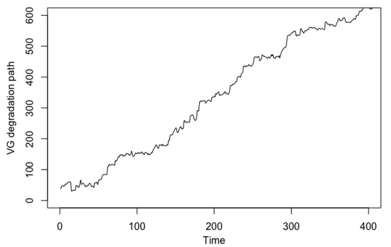 The variance gamma (VG) process was first introduced in 1990 by Madan and Seneta [5] as a new stochastic process for financial analysis. Continuous time specification, long tailedness, finite moments of all orders, good empirical fit, etc. are the main advantages of this process. They have several characteristics such as pure jump, approximable by a compound Poisson process with a high jump frequency, and low jump magnitudes. The main purpose of introducing the VG process was to substitute a common diffusion process such as the Black & Scholes (B & S) model for a non-monotonous and the positive trend modelling. VG can offer a better fit compared to (B & S) by providing low variances and high kurtosis [6]. VG process consists of four parameters that are developed as a generalised Brownian motion. It can be achieved by considering a Brownian motion with drift at a random time given by a gamma process. The presenting parameters allow control over the kurtosis and skewness of the increments distribution. The statistical density is observed to be symmetric with some kurtosis [7]. Several studies were performed in the past using the VG process [8,9,10,11,12,13,14,15], but the practicability of VG in modelling system degradation has never been explored in the past.