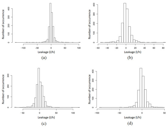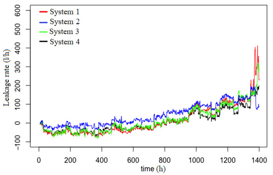 The main focus is only on the data describing the leak rate of seal pumps which constitute the degradation indicator. As soon as the seal’s leak rate of one of the pumps exceeds a limit set at around 1400 L/h, the system is stopped (more or less quickly) and the seal of the pump under consideration is replaced. This event technically represents the failure of the pump seal. An alarm threshold has been set at a leak rate of approximately 1100 L/h, in order to alert the operator early enough of a possible degradation of one of the seals and to be able to modify the operating conditions of the unit or carry out a maintenance operation to avoid breakdowns. The task after analyzing the data is to adapt an appropriate model that best describes the degradation phenomena, give a precise prognostic, and thereby propose an efficient maintenance policy. Finally, it is essential to verify the data in order to obtain the behaviour of the system. On the basis of Figure 3, it is shown that the different histograms of the four systems increments are symmetrical in all cases. The peaks represent the most common values and it can be observed that data dissemination varies but not significantly.