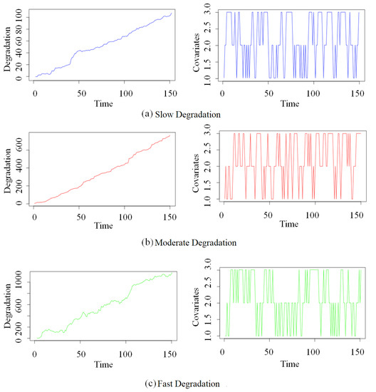 Figure 5 resumes the evolution of the degradation paths in the presence of the covariates for real data. It is evident that in the case of slow degradation, the degradation paths reaches the value of 100 L/h, moderate degradation paths reaches 600 L/h, and fast degradation paths reaches quickly the level of 1000 L/h of leakage at the same period of time t = 150 h. It also presents the fluctuation of the three covariates to express their impact on degradation speed.