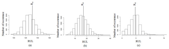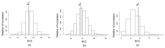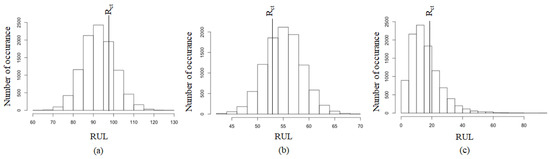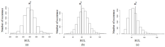 The efficiency of the classification method is proven, and it is essential to evaluate the quality of the prognostic. The histograms of RUL are evaluated for different VG parameters. Three combinations of VG parameters are proposed and will be used to model the three types of degradation. At , N = 10,000 degradation trajectories are generated and a predefined threshold is settled in order to define the different histograms of RUL. The idea is to assess the evolution of the histograms of RUL at inspection times. First step is to choose the degradation trajectory and to simulate N = 10,000 degradation trajectories, once they cross the predefined threshold the first RUL histogram is obtained. At , the parameters of the chosen path are estimated and will be used to generate N = 10,000 trajectories and to obtain the new RUL. The real crossing time of the chosen data will be compared to the two obtained histograms and will provide on the quality of the prognostic. Figure 10 presents the obtained histograms of the RUL for the different degradation paths.