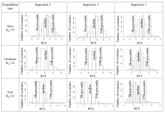 To investigate more about the quality of the prognostic, the histograms of RUL will be generated at different inspection times and the real crossing time will be compared to them. The histograms of RUL of three degradation types are evaluated, and the results are presented in Figure 17. For the slow degradation, the results presented in the first row show that the real crossing time has a good position compared to the three confidence intervals [ percentile, percentile] of the different histograms of RUL. The same results were observed for the moderate degradation where the is located in the confidence intervals and encountered by the histograms of RUL. Similar results were observed for the fast degradation, which leads to the conclusion that the failure of the system can be observed and detected before it happens. Thus the prognostic provided using the VG process can be considered as efficient since it detects the failure before it occurs.