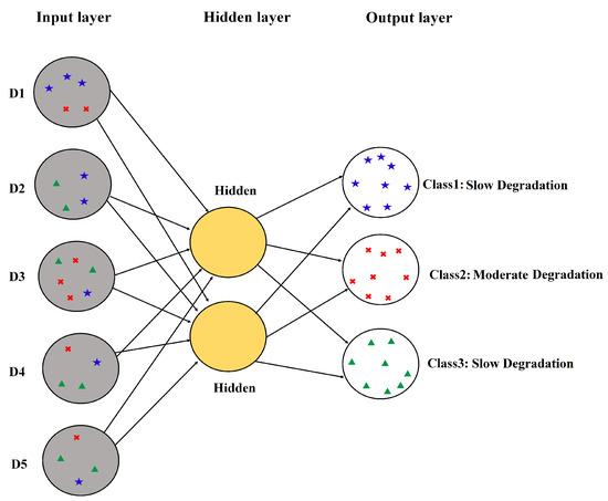 In this study, the neural network algorithm is used to ensure the classification of different degradation paths. The real data base describing the degradation of the centrifugal pump is examined and applied to be classified using the neural network algorithm. As explained before, the neural network algorithm consists of three major layers: First, hidden, and the output layers (Figure 8). The first layer will be assigned to take inputs based on the real existing data that will be dispatched to the hidden layers. Later the hidden layers will be replicated using back propagation to get three different clusters describing three types of degradations: Slow, moderate, and fast by optimising the weights of the input variables. The hidden layers are mainly used to improve the predictive power of the neural network model. The output layers are used to output the prediction results based on the data from the input and hidden layers (Figure 8). The architecture, the number of layers, and the number of neurons per layer are considered as hyperparameters of the NN algorithms and different combinations will be tested for obtaining an optimised result. The NN algorithms are applied to detect the type of degradation in this paper. It is crucial in NN algorithm to choose the features that can best present the data and help in detecting the difference between them. The used database is structured based on seven features that best describes the three different degradation types. For a better presentation of the data, the calculation of the mode, mean, skew, variance, kurtosis, as well as the minimum and the maximum of each degradation are presented. The database contains 300 observations with eight variables of which seven present the different features and the last one presents the type of degradation and will be assimilated to the output layer. The classification is based on the seven features introduced as the input layers and evaluated by the algorithm of the hidden layers. The NN algorithm consists of different steps where the first includes the scaling of the original data before applying the algorithm in order to speed up the process and obtain better convergence. The next step is to choose the number of hidden layers, nodes, and other arguments. Then, it is essential to convert a prediction back to the original format leading to creating a confusion matrix and to calculating the classification error.