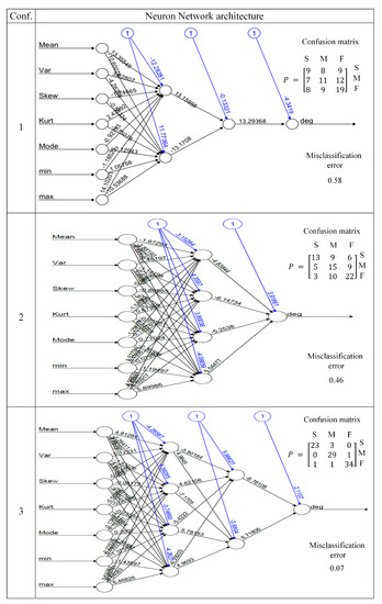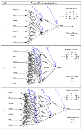 Figure 9 presents the results of the NN algorithm. The first row presents the first NN architecture. The seven features are introduced as the input layer of the NN algorithm. The hidden layers constitute two layers where the first layer has two nodes and another layer has only one node. The results show that the error of the misclassification calculated using Equation (14) is equal to 0.57. To improve the performance of the algorithm, the NN architecture changed to only one hidden layer with four nodes. The second row of the Figure 9 presents the results of the calculation of the NN algorithm, the input nodes will communicate with the four nodes of the hidden layers to ensure the classification. The error of the misclassification of the algorithm is calculated and improved from 0.57 for the previous architecture to 0.45 for the proposed one. The third row of Figure 9 shows the results of calculation of the error for the third architecture. The input nodes will communicate with the hidden layers constituted of two layers: The first with four nodes and the second with two nodes. The error of misclassification is calculated and equal to 0.06. The best performance of the NN algorithm was presented by the latest architecture.