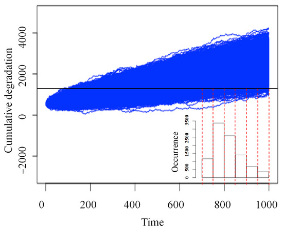The estimation of the parameters is essential to be considered. The estimated parameters of one chosen degradation path will be used to generate a number N = 10,000 of VG degradation paths. When the failure threshold is settled and the degradation paths cross the predefined threshold the time of the first passage time FT will be captured and used to obtain the histogram of the FT as shown in Figure 12.