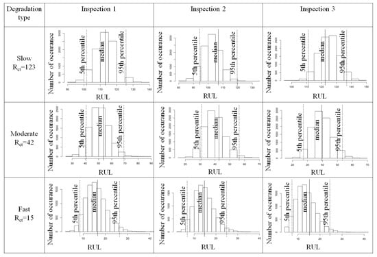 This conclusion can be more justified in Figure 13 where it resumes the impact of the covariates on the histogram of the RUL. The histogram of RUL of the fast degradation reaches the failure threshold faster than any other type of degradation. The time of crossing the failure threshold of the fast degradation occurs before 40 h, whereas for the moderate degradation it happens between 20 and 80 h. Slow degradation data recorded the latest time to achieve the failure threshold. They crossed the failure threshold over the period between 100 and 160 h. Another interpretation can be conducted, the real crossing time of the chosen degradation trajectory presenting the three degradations is compared to the histogram of the RUL. The position of the indicates the efficiency of the prognostic. It is important to evaluate the prognostic results when the values of the change. The first row of Figure 14 presents the results of the comparison of the position of the to the three histograms of RUL. The has a good location in the confidence intervals [5% percentile, percentile] of the three histograms allowing a conclusion that the failure of the system can be predicted. The same results were obtained for the two other degradation types, where at the different inspection time the real crossing time is located in the confidence intervals of the histograms of RUL. Based on the obtained results, the failure of the system modeled using the VG process can be predicted.