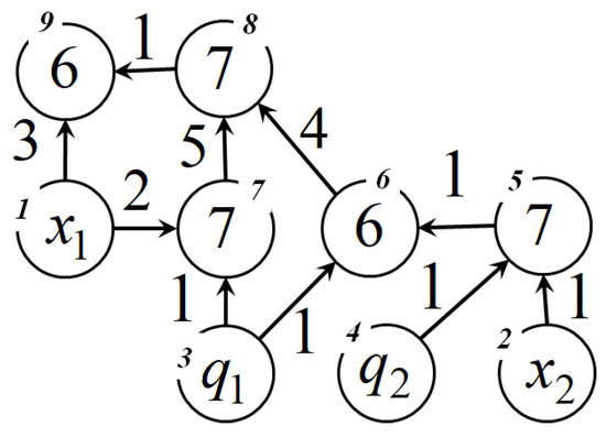 Each row of the matrix corresponds to a graph node. The numbers of nodes are located at the top of the nodes (see Figure 2). The nodes are numbered in such a way that the number of the node from which the arc exits must be less than the number of the node where the arc enters. Then a network operator matrix has an upper triangular form. In the network operator matrix the numbers of functions with two arguments are located on the main diagonal. Zero element on the main diagonal shows that the row corresponds to a source-node. Other non-zero non-diagonal elements are the numbers of functions with one argument.
