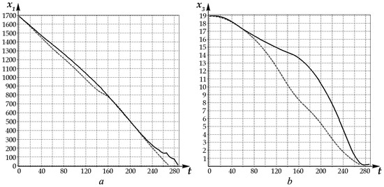 The graphs of control values over time: (a) control ; (b) control . Found solution—black solid line; reference solution—grey dashed line.