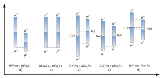 IRNs are described by specific arithmetic operations that are varied from arithmetic operations with classical RNs. Arithmetic operations between two interval rough numbers and are performed using Equations (1)–(5) [9,10]: