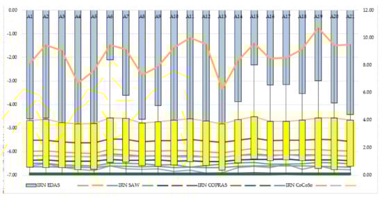 In Figure 3, it can be seen that when comparing the developed methodology with other IRN MCDM methods, there is a change in the ranks of all three methods. This is understandable taking into account the diversity of methodologies and the large number of alternatives being considered. It is important to emphasize that the alternatives that are in the first, second and third place in the original IRN PIPRECIA–IRN EDAS do not change their positions regardless of the applied method. Since changes in the rankings are noticeable, the SCC has been calculated in order to determine the correlation of the obtained results in a comparative analysis. The total SCC is 0.929, which means that the ranks are very highly correlated. When observing a single SCC, it is 0.958 comparing IRN PIPRECIA–IRN EDAS with IRN SAW, 0.966 with IRN COPRAS and 0.864 with IRN CoCoSO.