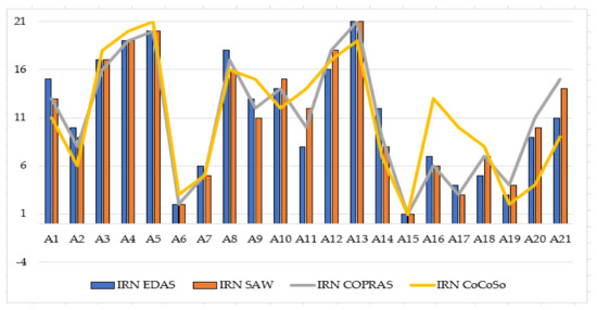 Ranks in a comparative analysis with other IRN MCDM methods.