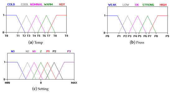 In practice, the components and execute in parallel. Each one will produce a membership value corresponding to the state and membership function after receiving a mode signal. After that, the minimum of the two output values will become the input of . The membership function of the component is determined by the following rules (for simplicity, only whose conditions with temperature COOL are displayed).