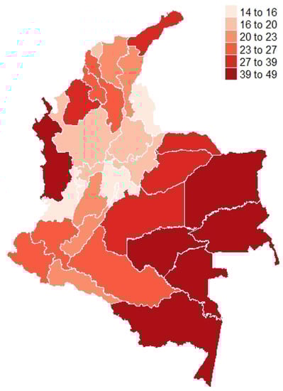 Results obtained from the fitting of the aforementioned models were consistent with the results obtained in previous analyses of a similar data set, reported in Cepeda-Cuervo, Córdoba and Núñez-Antón [22], where the authors modeled mortality rates for children younger than five years old of age in Colombia. Their analysis found positive significant relations with the variable explaining the index of unsatisfied basic needs (i.e., NBI) and negative significant relations with the variable representing the resources provided by the government for academic achievement of the population (i.e., Rec) when assessing their effect on the infant mortality rates under study. In our case, for infant mortality rates for children under one year of age, this significant relationship also holds and, in addition, a positive significant relationship was also identified with the percentage of women who had suffered physical violence from their current partners (i.e., Viol). As in Cepeda-Cuervo, Córdoba and Núñez-Antón [22], in this application we have also found evidence of positive spatial autocorrelation in the data under study. In addition, we have also fitted the generalized spatial conditional normal Poisson model, which provided more flexibility by allowing the dispersion to vary as a function of some explanatory variables.