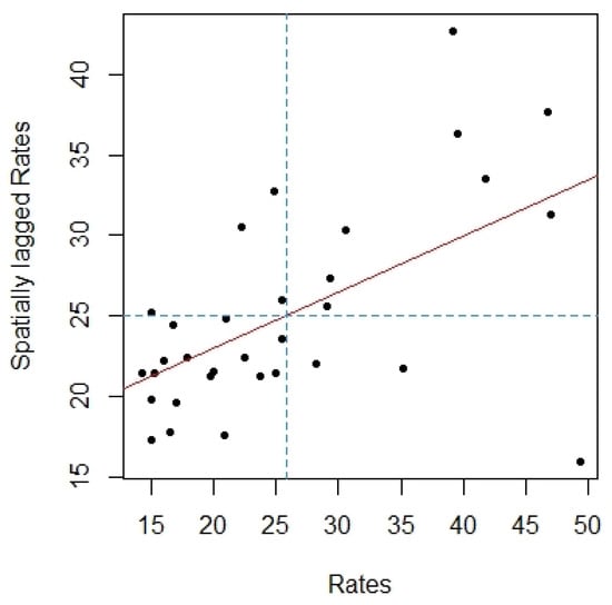 In order to be able to assess the possible existence of spatial dependence in the data, we apply the global Moran’s I contrast [40] to the variable Rates, obtaining a test statistic value of I = 0.3490, providing a p-value = 0.0017. Hence, for the specific data set under study, there is evidence against the null hypothesis that the values of the variable Rates are randomly distributed across the different regions in Colombia. This result can be better seen in a graphical display in Moran’s scatterplot, shown in Figure 2, where the variable Rates is plotted against the spatial lag , and where a red line represents the estimated linear regression line fitted for these two variables. The slope of this regression is precisely Moran’s I statistic and, as can be seen in Figure 2, the values of the variable for each department appear to have a positive significant correlation with the averaged values of the variable in the adjacent regions. Hence, there is substantial evidence for the possible existence of positive spatial autocorrelation in the data that need to be accounted for in the models to be fitted in the following sections for its analysis.