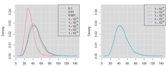 The prior distribution , assumed for the inverse of the variance parameter for the random effects, that is, for the precision parameter , can have a significant effect on the inferential process, so inference may be quite sensitive to the choice of the fixed parameters in this gamma distribution (see [36]). Therefore, in order to better assess this effect and select prior distributions where it is limited or at least controlled for, we have performed a sensitivity analysis for the best fitting model in the previous section, the spatial conditional normal Poisson model with regression structure given by Equation (17), considering different possible values for in the gamma prior distribution for the precision parameter in the random effects, from to . Results are included in Table 6, where we can observe that for values of , as well as for smaller values, there were only small differences in the estimates in the third decimal place for a few cases. If we also look at the posterior marginal densities for the estimated precision parameter (see right panel in Figure 4), no changes are observed when setting the values for in the prior distributions for the last five values considered here (i.e., from up to ). Therefore, we believe the choice of the value is well justified and, in addition, it does not appear to represent any undesirable influence on the inferential process considered here.