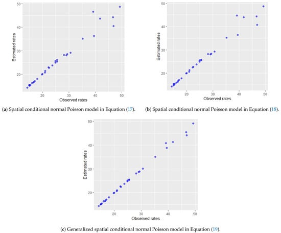 As part of the posterior predictive checks required to better assess the fit of a model, Figure 5 includes the scatterplots for the observed mortality rates versus the predicted mortality rates for some of the fitted models. From the plots in Figure 5a,b, we can mention that the spatial conditional normal Poisson models in Equations (17) and (18) show high accuracy in the prediction of mortality rates for observed rates under 40 whereas, for some of the values larger than 40, predictions slightly deviate from the observed values. The scatterplot included in Figure 5c for the generalized spatial conditional normal Poisson model in Equation (19) shows a considerable improvement, mainly because values of the mortality rates larger than 40 are now more accurately predicted.