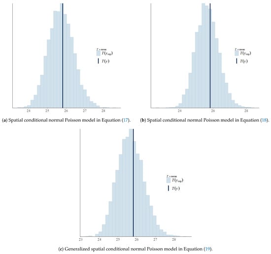 Figure 6 includes histograms of the posterior predictive distributions for the means over replicated simulations of the mortality rates, estimated from the fitting of the spatial conditional normal Poisson model in Equation (17) (see Figure 6a) and Equation (18) (see Figure 6b), and by the generalized spatial conditional normal Poisson model in Equation (19) (see Figure 6c). As we can see from these figures, they show how the means of the replicated data vary with respect to the actual mean of the observed values, a fact suggesting that the considered models offer an adequate fit to the data set under study.