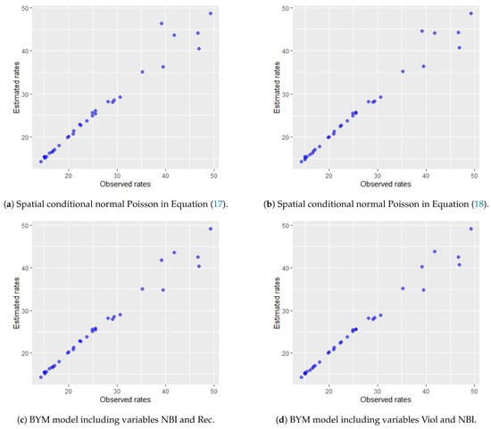 Scatterplots for the observed versus the predicted rates obtained by fitting the spatial conditional normal Poisson and Besag–York–Mollié (BYM) models in INLA for some of their reduced versions.