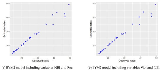Figure 8 shows the scatterplots of the observed versus the predicted values of infant mortality rates obtained from the fitting of some of the reduced versions of the BYM2 model in Equation (22). If we compare these plots to the ones from Figure 7, no significant differences can be seen. Hence, there are no improvements in terms prediction accuracy in the fitting of the BYM2 over the previously fitted BYM models that can be reported.