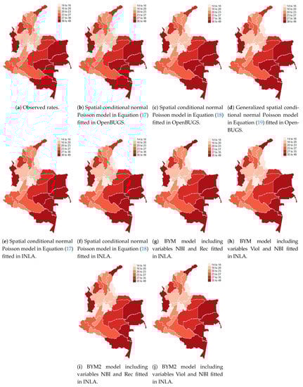 Finally, in order to illustrate the performance of the fitted models, Figure 9 includes maps of the observed infant mortality rates (i.e., variable Rates, see Figure 9a) and of the estimated mortality rates obtained by fitting some of the models considered here. As can be seen, the maps of the estimated mortality rates obtained by fitting the spatial conditional normal Poisson model in Equations (17) (see Figure 9b) and (18) (see Figure 9c) in OpenBUGS, and for the generalized spatial conditional normal Poisson model in Equation (19) (see Figure 9d) suggest that these three models, presented in Section 3.1 and Section 3.3, provided similar estimations of the mortality rates and, in addition, that their fitted values maps are almost identical to the map for the observed values in Figure 9a. This fact is consistent with their observed versus predicted mortality rates scatterplots (see Figure 5 in Section 3.3). Moreover, the maps for the spatial conditional normal Poisson models considered above, fitted in INLA (see Figure 9e,f, respectively) also appear to be very similar to the map for the observed rates in Figure 9a.