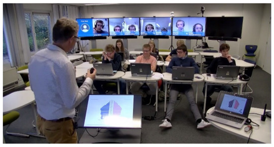 The video recordings concern lectures in higher education that take place in a hybrid virtual classroom [5]. In this relatively new learning setting (see Figure 1), on-site and remote learners are synchronously connected, which makes it even more difficult for the teacher to grasp the engagement of the student group (see [5] for a more detailed description of the learning space). If engagement could be measured automatically, this could be used as immediate feedback to the teacher and support him/her in educational decision making.