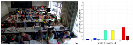Example of the clustering approach applied to the keypoints of students’ heads. Students are allocated to different clusters depending on their eye-gaze direction (here in a face-to-face setting). Students allocated to the red cluster tend to look to the front. The yellow, light green and dark blue clusters group students that are looking to the side or backwards. The feature spaces covered by each of these clusters only differ in a subtle and not necessarily meaningful way. As an example, the students allocated to the yellow cluster seem to have a larger nose-to-chest distance. The blue cluster includes a student that is looking down. Results are less consistent for the dark red cluster that includes two front-row students that were wrongly detected. The graph in the top right corner shows , the collective state distribution.