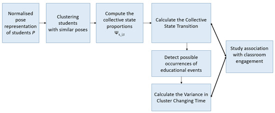 The indicators for student engagement can be split into two groups: measures of individual behaviour and measures of collective behaviour. The predicted poses are taken as input by an action recognition component, which is in charge of providing cues for behaviour at the individual level. These cues represent action units of which the literature has shown their possible relevance for student (dis)engagement (actions such as raising hands, taking notes, etc.). In parallel, the predicted poses are also given as input to a collective analysis component which will aggregate the body poses of all students and which will provide cues related to the collective/group behaviour of students in the classroom. Such measures are related to synchrony or reaction times [37]. This high-level approach is illustrated in Figure 2.