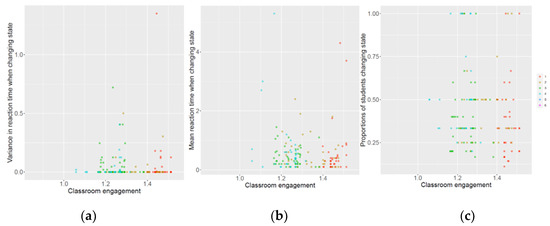 The results show that the variance in students’ reaction time to educational events does not correlate with the average engagement of the classroom (r = 0.03, p = 0.69). The same observation applies to the mean of students’ reaction times (r = −0.07, p = 0.42) and to the proportion of students that react to an educational event by changing cluster (r = −0.08, p = 0.33). The scatterplots in Figure 7 illustrate these observations.