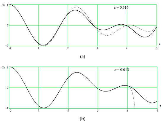 In previous works, researchers usually supposed that and neglect the second term in square brackets in Equation (11) even if the angular rate is not constant [3]. In this case, the solution of Equation (11) is simple and obtained in the form of trigonometric functions. However, if we need to study high-intensive dynamic processes with variable angular rates [5,6], we cannot omit the term and must solve ODE (11) with a variable coefficient.