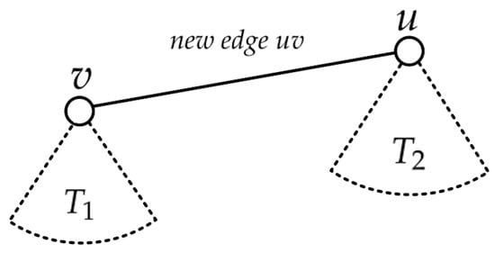 Suppose and are trees with specific vertices v and u, respectively. Let be the tree with the specific vertex u, which is obtained by joining a new edge from the union of and , as depicted in Figure 3.