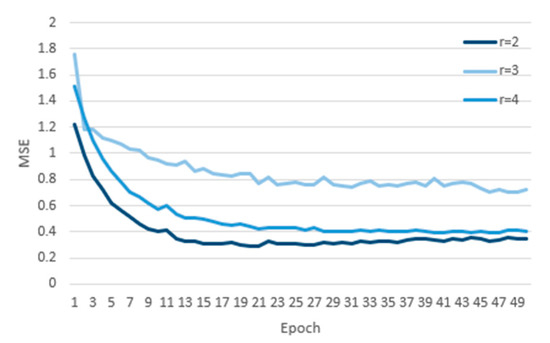 The receptive field of the model can be increased in two ways: selecting a larger filter size k and increasing the expansion factor d. The r represents the multiple of the dilation rate of each layer. For example, r = 2 represents dilation rates = [1,2,4]. TCN models with dilation rates of r = 2, r = 3, and r = 4 are constructed, and the experimental data are substituted into the model for calculation, while the loss curves are drawn by using the mean square error (MSE), as shown in Figure 2. We found that the MSE value of the TCN model with dilation rate r = 2 is the minimum under the same iteration number. Therefore, we used the TCN model with r = 2 for forecasting.