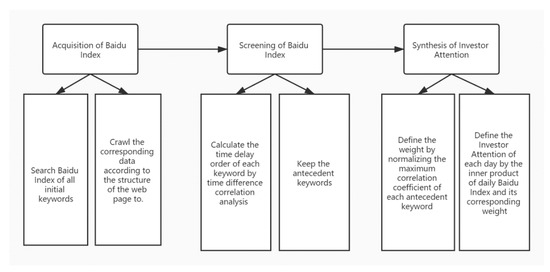 The first step was the synthesis of the investor attention factor. The Baidu search index was acquired through the crawler, and then, the antecedent keywords were filtered through the time-difference correlation analysis. Finally, the investor attention factor was synthesized according to the time difference correlation coefficient between the antecedent keywords and the realized volatility.
