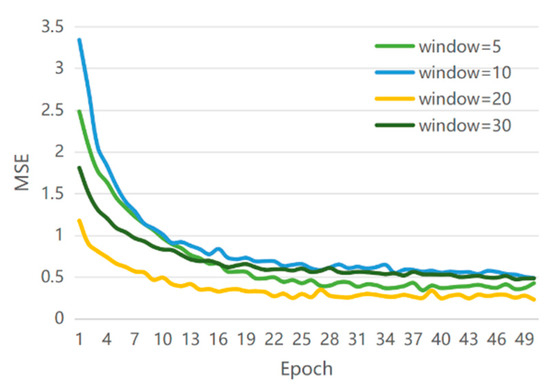 In order to analyze the influence of the width of time window on the prediction effect of the TCN model with the investor attention factor, we selected a time window of 5 days, 10 days, 20 days, and 30 days to construct the training data. The corresponding MSE is shown in Figure 6.
