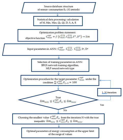 A block diagram of finding the optimal energy consumption by the method of training neural networks is shown in Figure 1. The procedure includes five main stages: