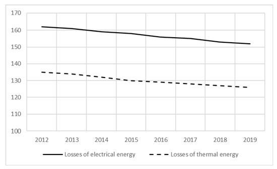 For the studied years 2012–2019, there is a positive trend in reducing the amount of energy losses, both in electrical (reduction index in 2012–2019—93.8%) and thermal energy (reduction index in 2012–2019—93.3%) (Figure 2). However, the amount of electricity losses of 15.2% of the total volume of transmitted energy remains relatively high in Russia. In comparison, in industrially developed countries it is as follows: Germany—7.6%, Finland—6.7%, USA—6.5%, Canada—6.3%, Japan—5%.