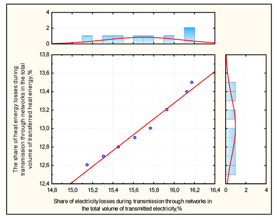 Figure 3 shows a scatter diagram that visualizes the relationship between losses of electrical and thermal energy in distribution networks. The equation of the linear trend of the obtained dependence on the scatter diagram has the form Y = −0.4688 + 0.859X. Correlation coefficient of heat and electric energy losses Kor = 0.98. This indicates a close relationship between the parameters. A stable reduction in the amount of energy losses in distribution networks is probably not a random phenomenon but is due to purposeful management actions of executive authorities and enterprise management [48].