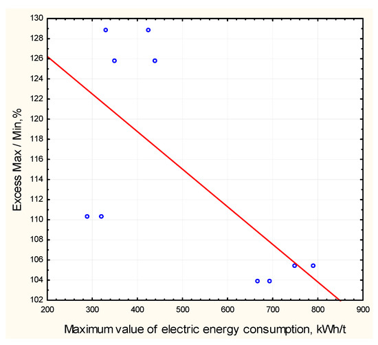 The range of limit values of specific energy consumption as a percentage of Dcr is expressed mathematically through the excess of the max value over the min value: Dcr = Pr—100. The dependence of the range of limit values of specific energy consumption on the average consumption rate is confirmed in the scatter diagrams. Figure 4 shows an absolute inverse relationship between the values of the electrical capacity of rubber and the range of the min–max values corridor (correlation coefficient Kor = −0.77). Therefore, it can be assumed that in the production of high-power products, the rate of loss of electrical energy should be significantly lower. Attention should be paid to technical losses of electricity due to physical processes in electrical equipment, avoidance of idle time and downtime of high-power installations.
