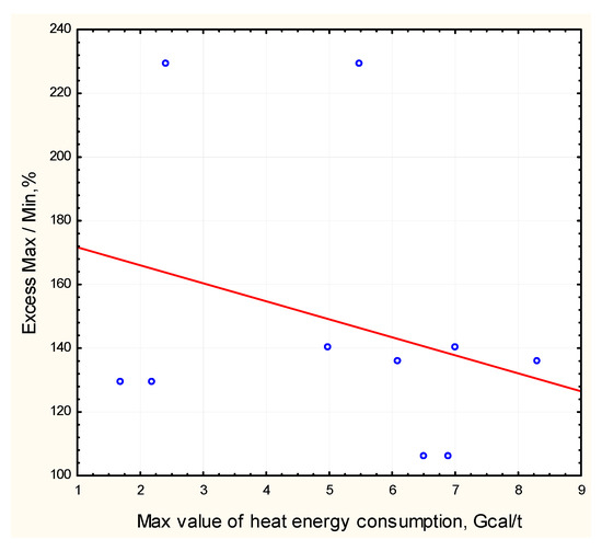 The dependence of the range of limiting values of the specific consumption of heat energy on the average consumption rate is weakly negative, with small tightness of connection (Kor = −0.35) (Figure 5). The lower correlation of the parameters is due to the use of secondary heat resources in sufficiently large volumes due to the integration of cold and hot flows in chemical processes. It should also be noted that in addition to purchasing heat energy on the market, enterprises can produce it independently, spending electric energy on it. Nevertheless, we consider it expedient to use the criterion of the average specific resource consumption to produce products when calculating the rates of heat loss.