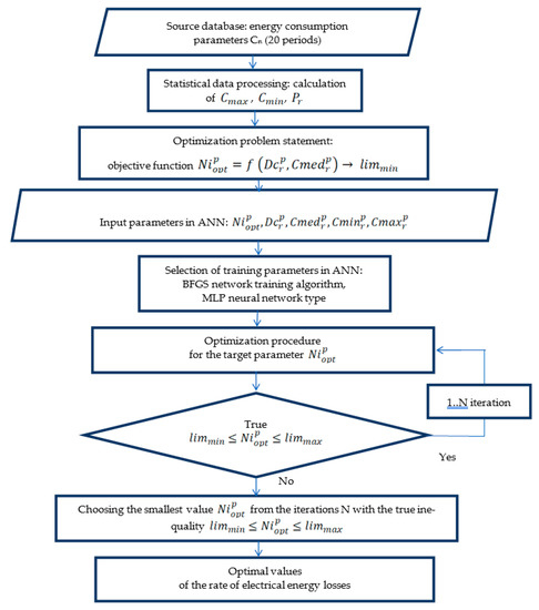 The block diagram of finding the optimal energy consumption by the method of training neural networks is shown in Figure 6. The sequence of operations is according to the block diagram for determining the optimal energy consumption (see Figure 1).
