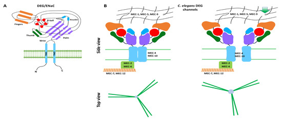Degenerin (DEG)/Epithelial Sodium Channel (ENaC)/Acid-Sensitive Channel (ASIC) structure and gating. (A) Representative cartoon of DEG/ENaC/ASIC channel monomers. DEG/ENaC/ASIC channel monomers share a similar structure composed of two transmembrane domains, N and C terminals, and a large extracellular loop resembling a hand. The wrist connects the transmembrane domain to the seven stranded -sheet palm and the -helical thumb, while the -ball is surrounded by the fingers and knuckle [14,15,16] (adapted from [15,55]). (B) Hypothetical gating mechanism of C. elegans DEG channels. The molecular bases of mammalian ASIC channels mechanical gating are still poorly explored. In the case of C. elegans, it has been established that the pore-forming subunits MEC-4 and MEC-10 interact with the paraoxonase-like and the stomatin-like proteins MEC-2 and MEC-6 [46,47,48] and with the special tubulins MEC-7 and MEC-12 [44]. In addition, the extracellular matrix components, MEC-1, MEC-5, and MEC-9, might be critical for force transduction [42,43] by directly associating with the pore-forming subunits (adapted from [38,55]).