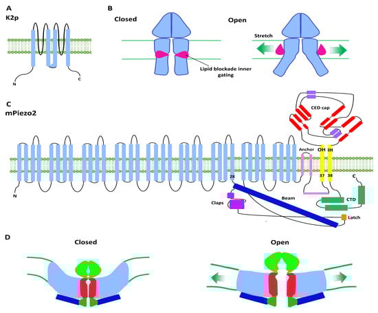 Two models have been proposed to explain how the channel responds to mechanical stimuli: the “force-from-tether” and the “force-from-lipid” model. The main difference between the two models is that in the first, the channel has to be bound to intra/extracellular structures such as the cytoskeleton and/or the extracellular matrix [3] (Figure 1B and Figure 2B), while in the second, the force is transmitted to the channels directly through the lipid bilayer (Figure 3B,D).