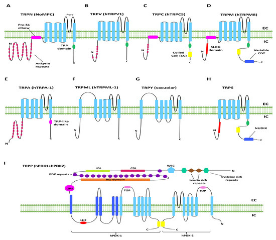 Transient Receptor Potential (TRP) channels diagram. (A) TRPN (NoMPC). TRPN channels have six transmembrane domains with 29 highly-conserved ankyrin repeats (adapted from [99]). (B) TRPV channels. Representative diagram of human TRPV1 channels. In addition to the six transmembrane domains, TRPV channels have six ankyrin repeats (adapted from [99]). (C) TRPC channels. Representative diagram of TRPC channels (e.g., hTRPC5). In addition to the six transmembrane domain, TRPC5 channels have four ankyrin repeats, a PRE-S1 domain, as well as a coiled-coil domain (adapted from [99,103]). (D) TRPM channels. Representative structure of the TRPM channels (e.g., hTRPM8). The channels have six transmembrane domain, a SLOG domain, a TRP domain, a coiled-coil domain, and a Variable C-terminal domain. The Variable C-terminal domain could encode an alpha-kinase domain or a nudix-hydrolase domain. (adapted from [99,104]). (E) TRPA channels. Structure of human TRPA-1 channels (e.g., hTRPA1, adapted from [99,105]). TRPA channels have a high number of ankyrin. The number of ankyrin domains is variable between species and between TRPA1 channels of the same species. (F) TRPM-L channels. (adapted from [99]). (G) Structure of the vacuolar TRPY channels (adapted from [99,106]). (H) TRPS channels. The structure of TRPS channels needs further investigation. Their structure is similar to that of TRPML channels, and they are expressed among mollusks, nematodes, tardigrades, myriapods, and chelicerates [99]. Their structure includes a SLOG domain, a TRP domain, and a nudix-Hydrolase domain. (adapted from [99,107]). (I) TRPP channels. Structure of the TRPP channels (e.g., hPDK-1 and hPDK-2). PDK-1 and PDK-2 are expressed together and form a protein complex (adapted from [108]).