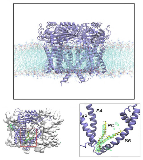 Some atomistic simulations have been performed specifically concerning this last point, which can be viewed as related to mechanosensing, in the sense that upon concerted motion of channel protein and membrane lipids, isolated lipid chains can occupy specific binding pockets and, therefore, favor or disfavor channel opening. In particular, Kir2 and PC2 have been investigated [194,195,196], and specific lipid-binding sites have been identified for these channels (see Figure 5).