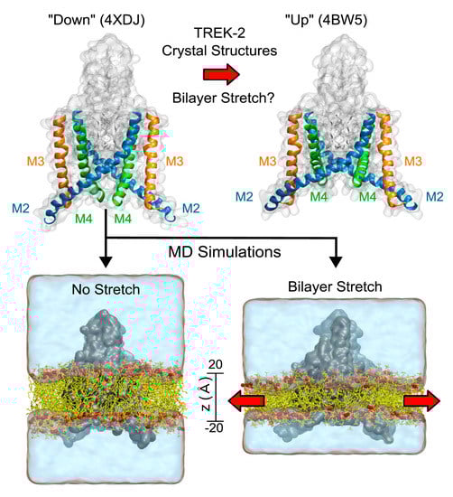 - Brennecke, J.T.; de Groot, B.L. Mechanism of mechanosensitive gating of the TREK-2 potassium channel. Biophys. J. 2018, 114, 1336–1343. [Google Scholar] [CrossRef]